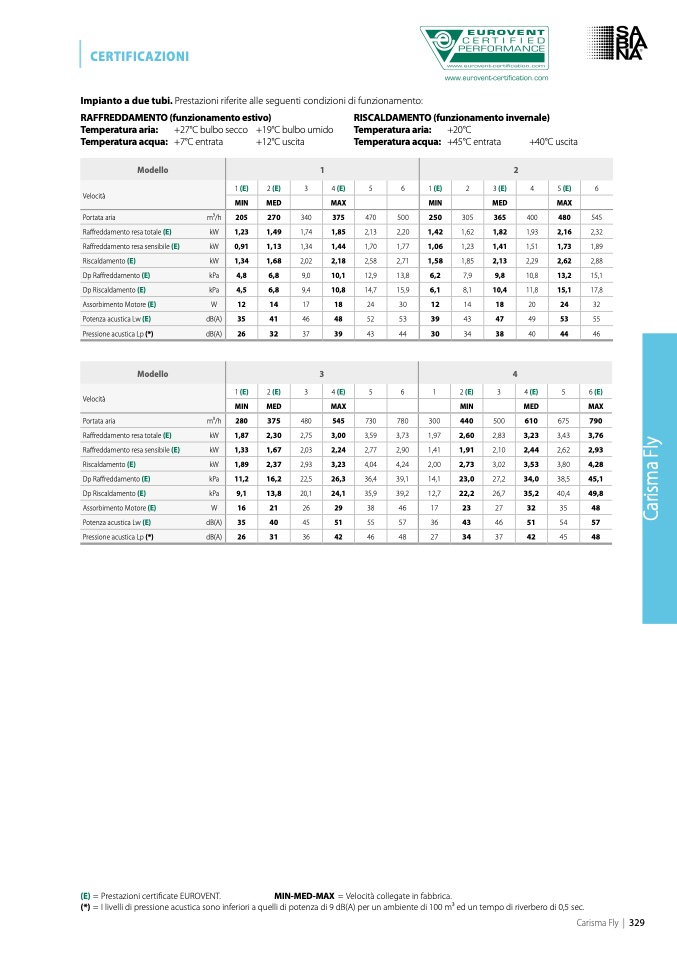 Impianto a due tubi. Prestazioni riferite alle seguenti condizioni di funzionamento: