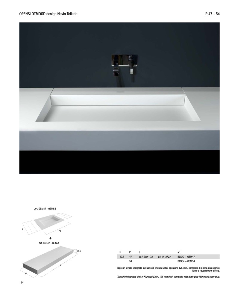 Top con lavabo integrato in Flumood finitura Satin, spessore 125 mm, completo di piletta con scarico