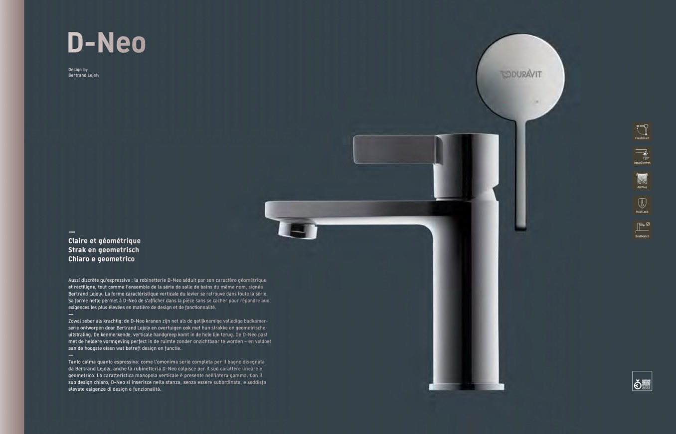 da Bertrand Lejoly, anche la rubinetteria D-Neo colpisce per il suo carattere lineare e