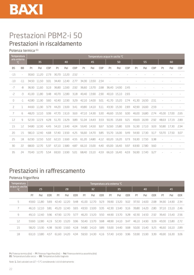 Pt: Potenza termica (kW) - Pf: Potenza frigorifera (kW) - Pel: Potenza elettrica assorbita (kW)