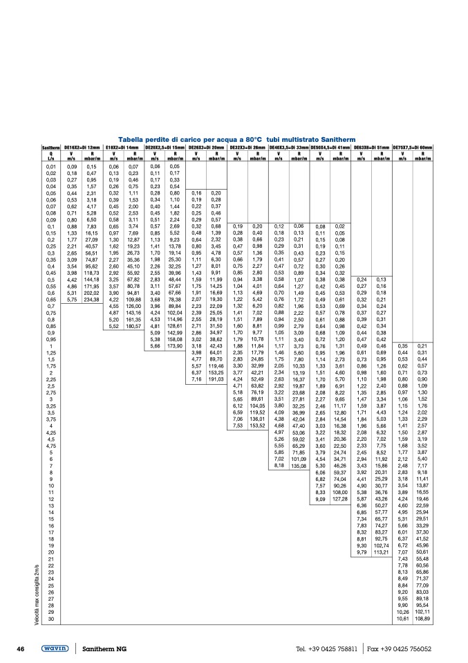 Tabella perdite di carico per acqua a 80°C tubi multistrato Sanitherm