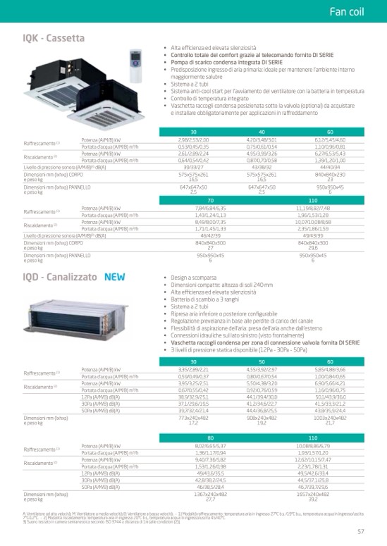 A: Ventilatore ad alta velocità; M: Ventilatore a media velocità; B: Ventilatore a bassa velocità. - 1) Modalità raffrescamento: temperatura aria in ingresso 27°C b.s. /19°C b.u., temperatura acqua in ingresso/uscita