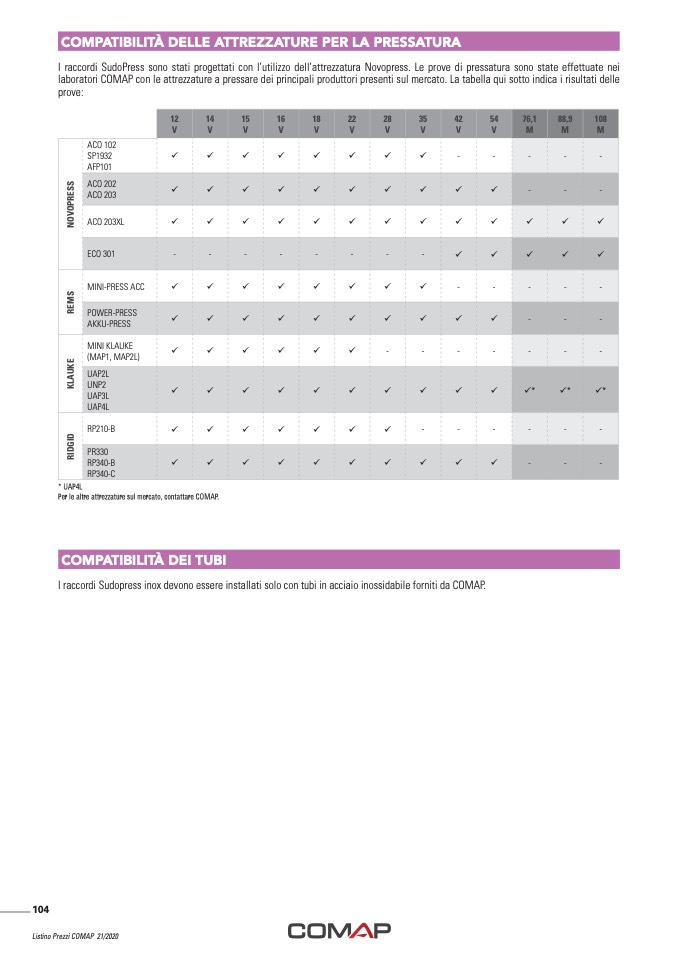 I raccordi Sudopress inox devono essere installati solo con tubi in acciaio inossidabile forniti da COMAP.