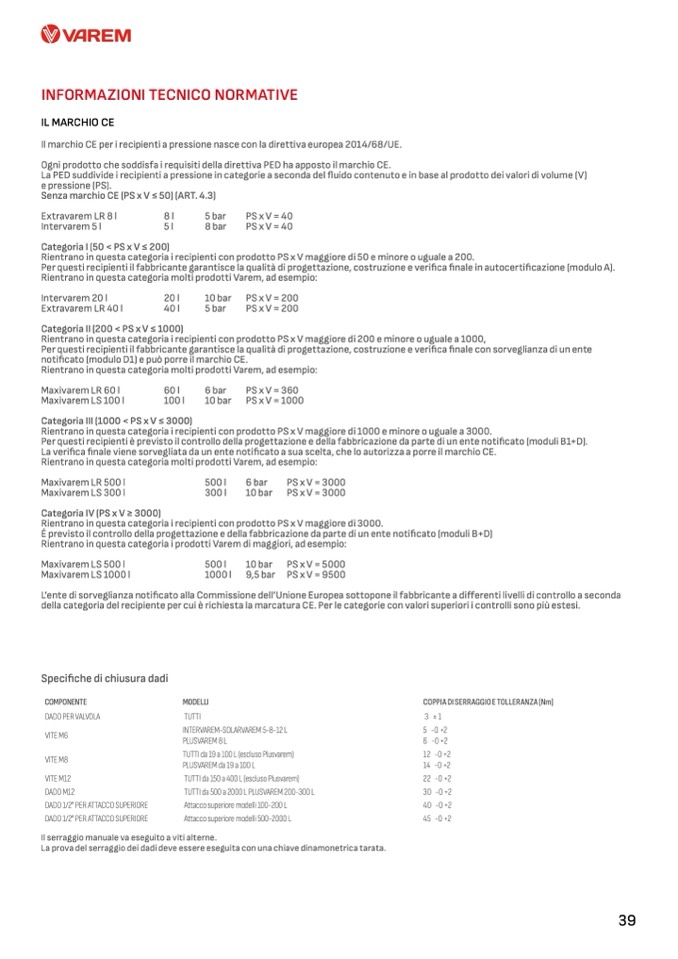 della categoria del recipiente per cui è richiesta la marcatura CE. Per le categorie con valori superiori i controlli sono più estesi.