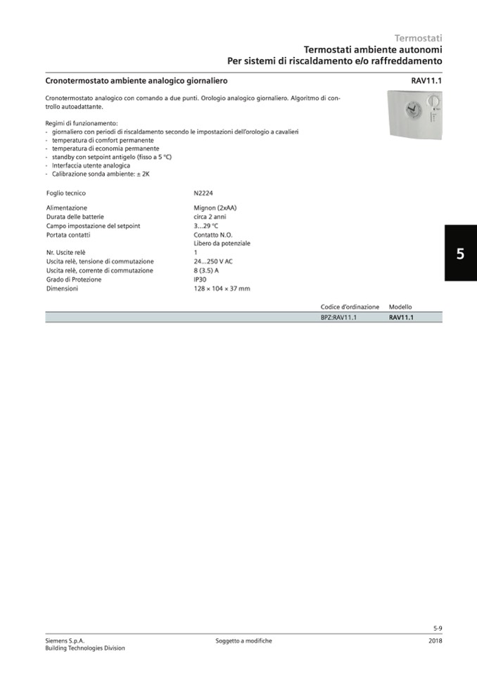 Cronotermostato analogico con comando a due punti. Orologio analogico giornaliero. Algoritmo di con-