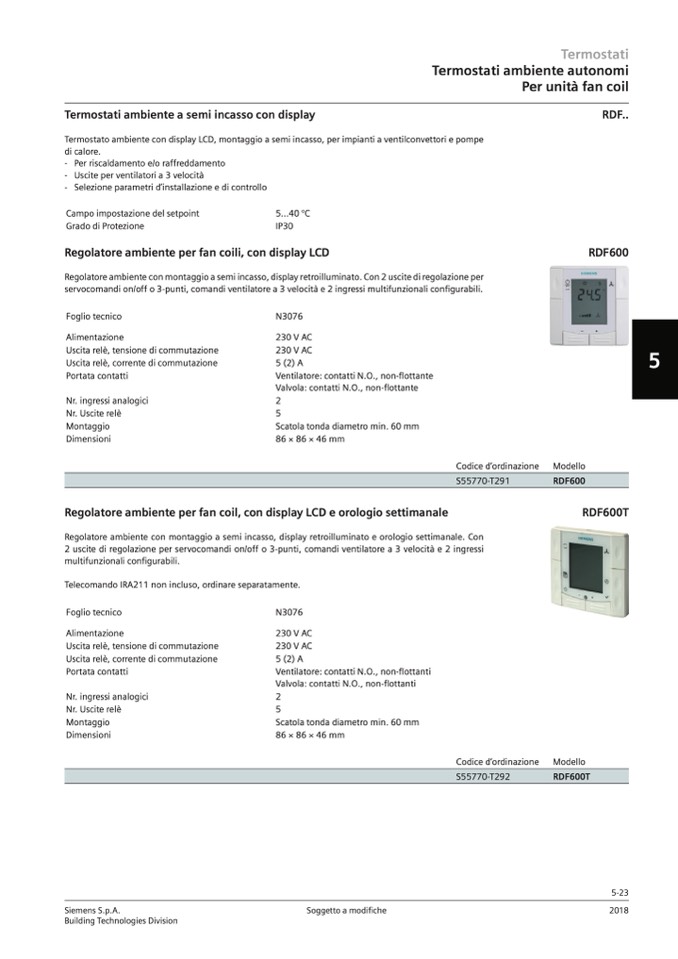 Termostato ambiente con display LCD, montaggio a semi incasso, per impianti a ventilconvettori e pompe