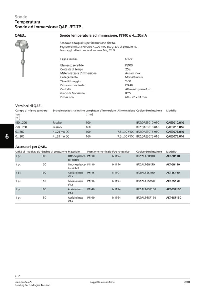 Sonde temperatura ad immersione, Pt100 o 4...20mA