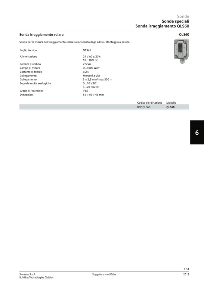 Sonda per la misura dell’irraggiamento solare sulla facciata degli edifici. Montaggio a parete.