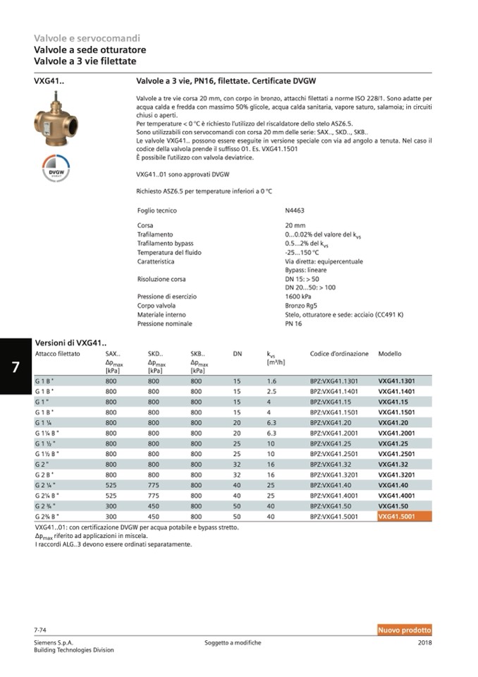 codice della valvola prende il suffisso 01. Es. VXG41.1501