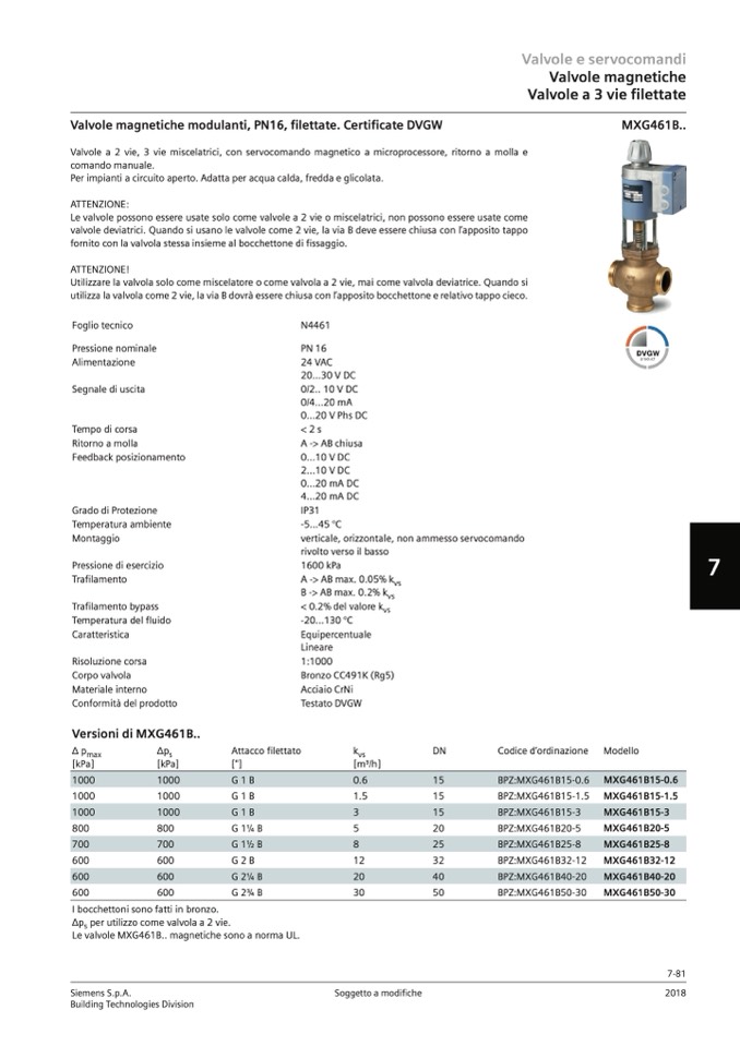 Le valvole MXG461B.. magnetiche sono a norma UL.