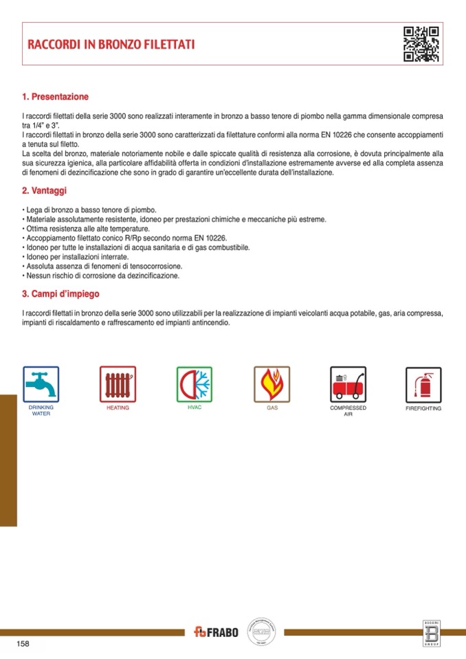 I raccordi filettati in bronzo della serie 3000 sono utilizzabili per la realizzazione di impianti veicolanti acqua potabile, gas, aria compressa,