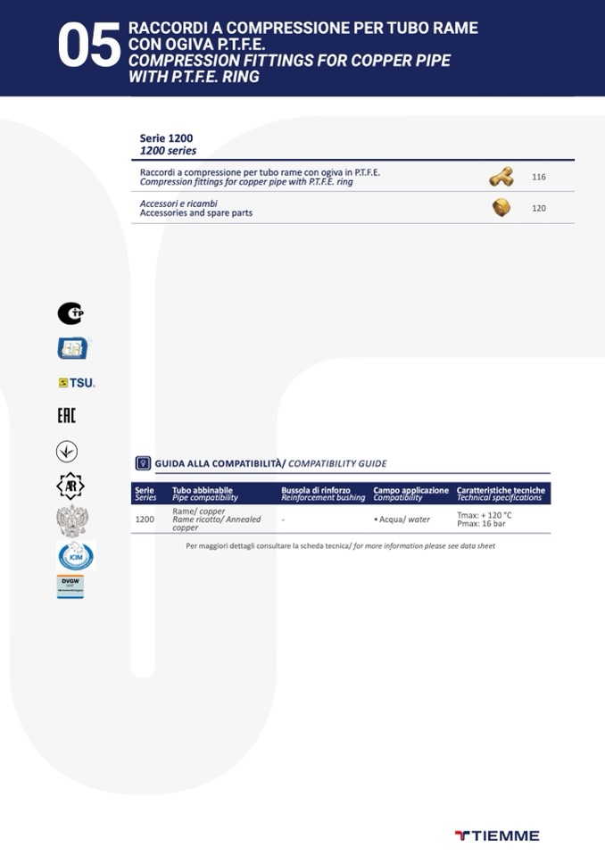 Raccordi a compressione per tubo rame con ogiva in P.T.F.E.