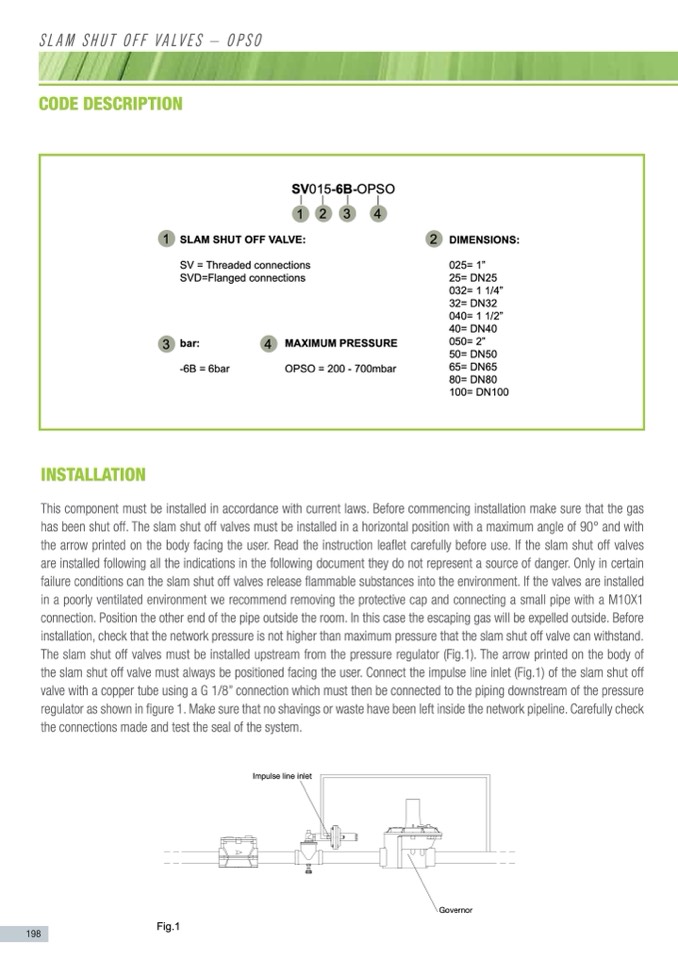 The slam shut off valves must be installed upstream from the pressure regulator (Fig.1). The arrow printed on the body of