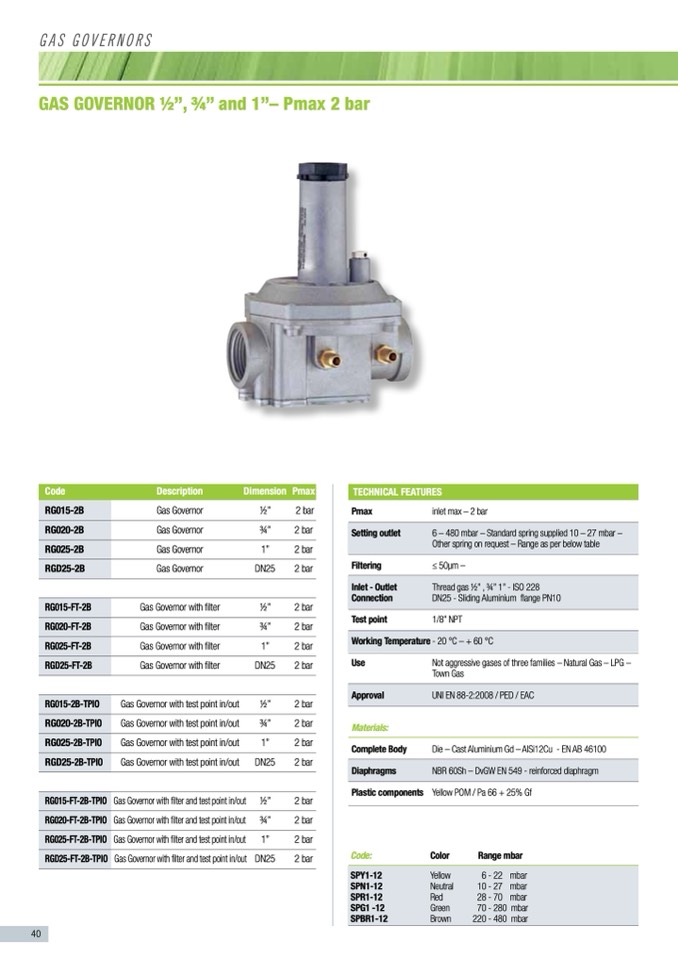 6 – 480 mbar – Standard spring supplied 10 – 27 mbar –