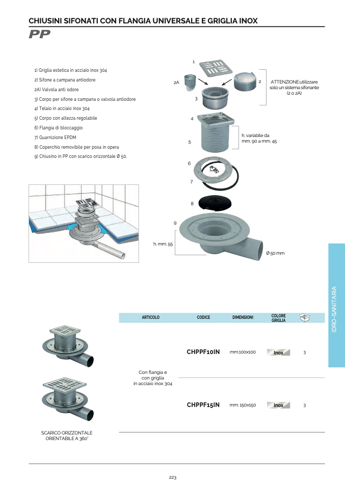 9) Chiusino in PP con scarico orizzontale Ø 50.
