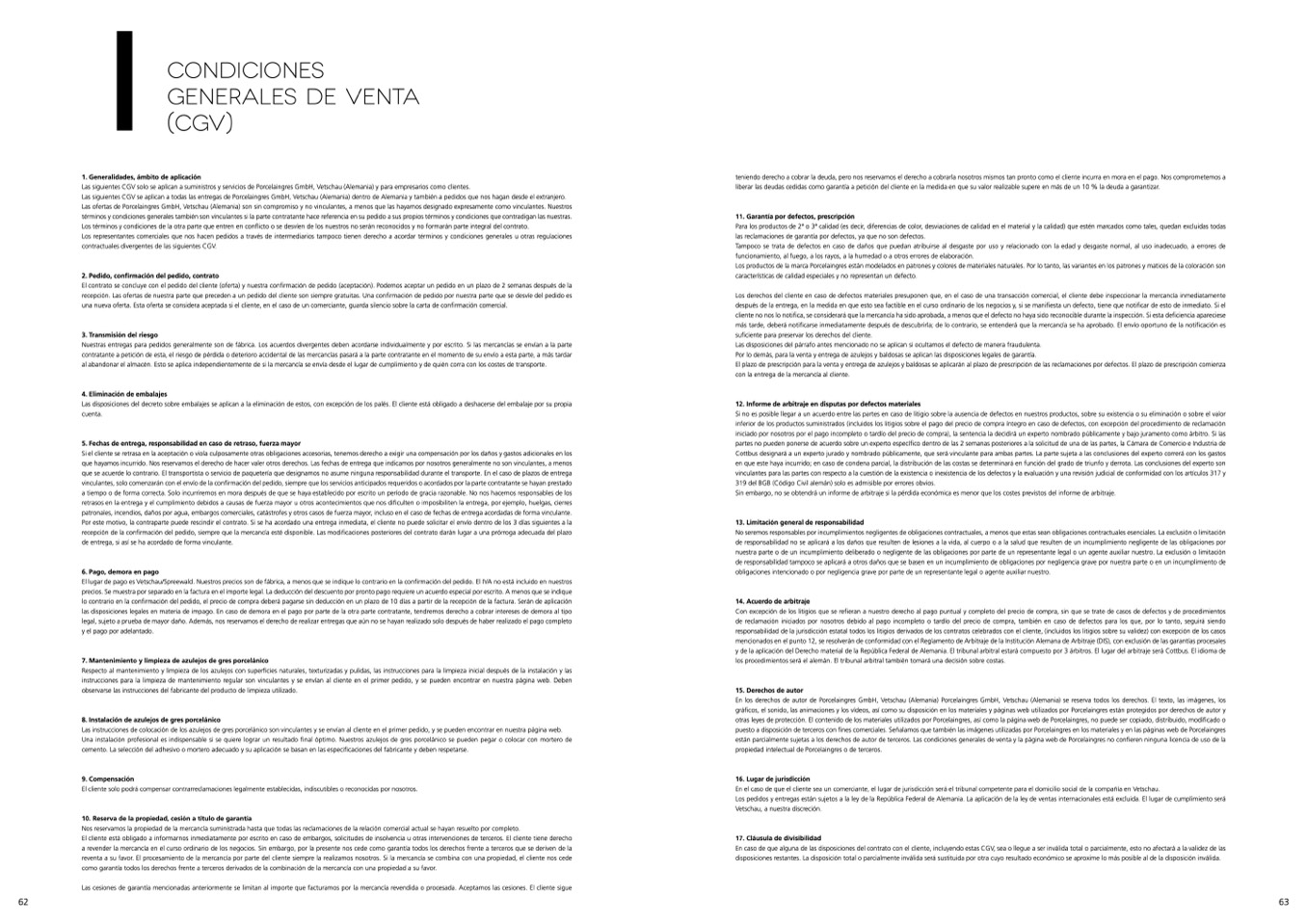 Las siguientes CGV se aplican a todas las entregas de Porcelaingres GmbH, Vetschau (Alemania) dentro de Alemania y también a pedidos que nos hagan desde el extranjero.