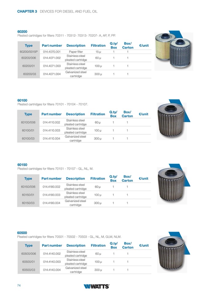 Pleated cartridges for filters 70501 - 70502 - 70503 - GL, NL, M, GLM, NLM.