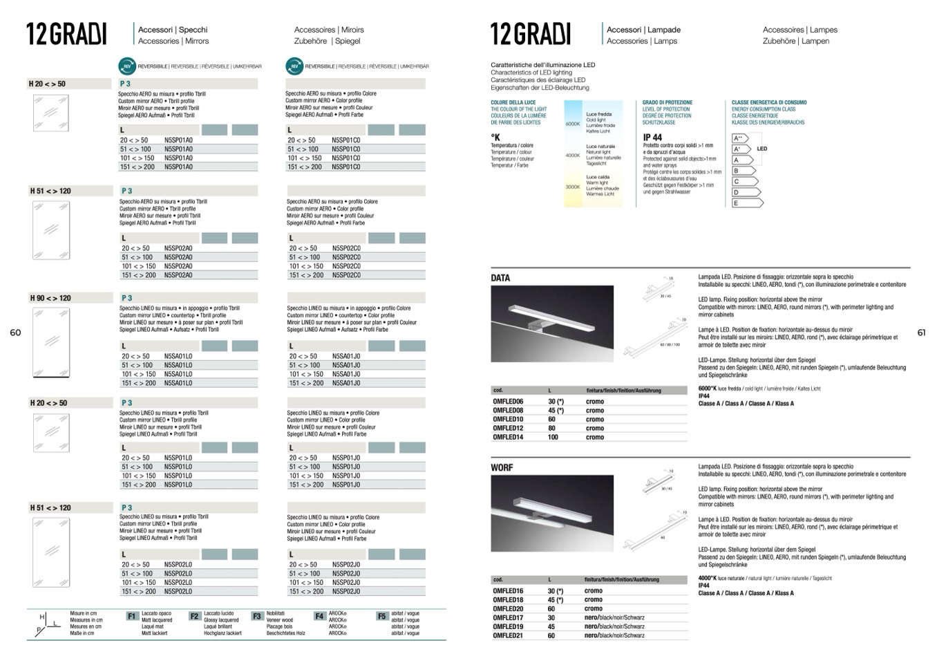 Installabile su specchi: LINEO, AERO, tondi (*), con illuminazione perimetrale e contenitore