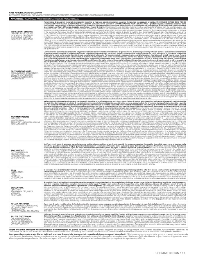 Gres porcellanato decorato: florim indica di stoccare il materiale in magazzini coperti o al riparo da agenti atmosferici / Florim recommends to stock the goods in covered warehouses, d