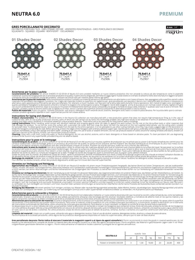 ctéristiques du produit: Les articles SHADES 01-02-03-04 de Neutra 6.0 ont été soumis à un nouveau système de production qui ne prévoit pas la cuisson à de hautes températures comme pour le