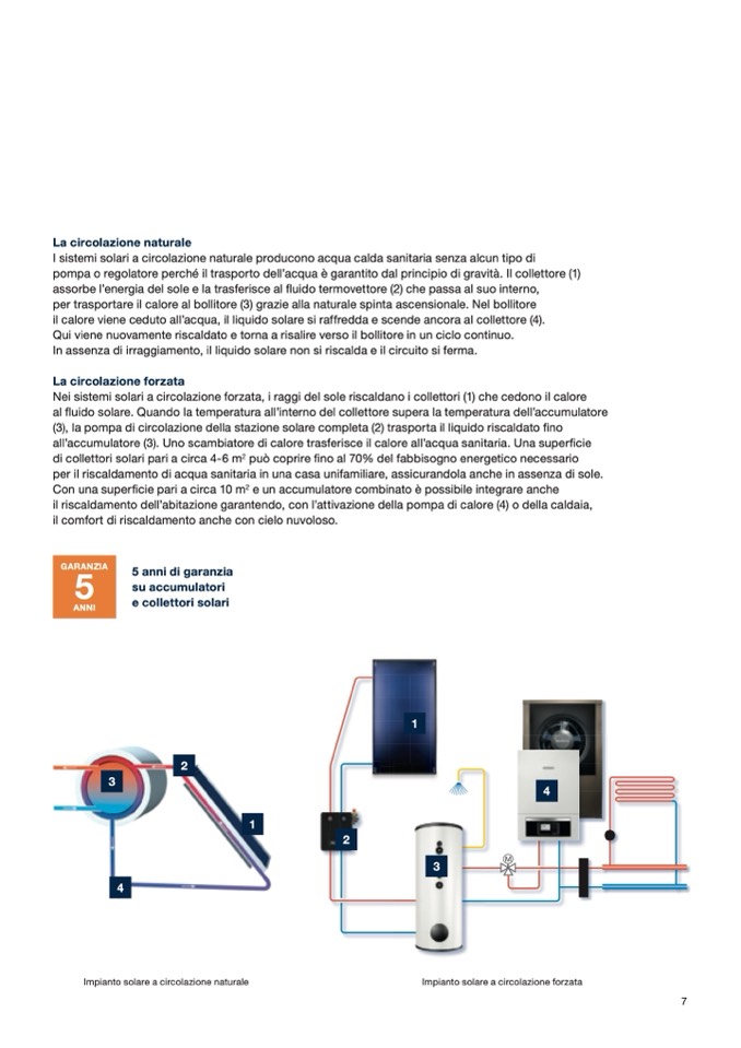 Nei sistemi solari a circolazione forzata, i raggi del sole riscaldano i collettori (1) che cedono il calore