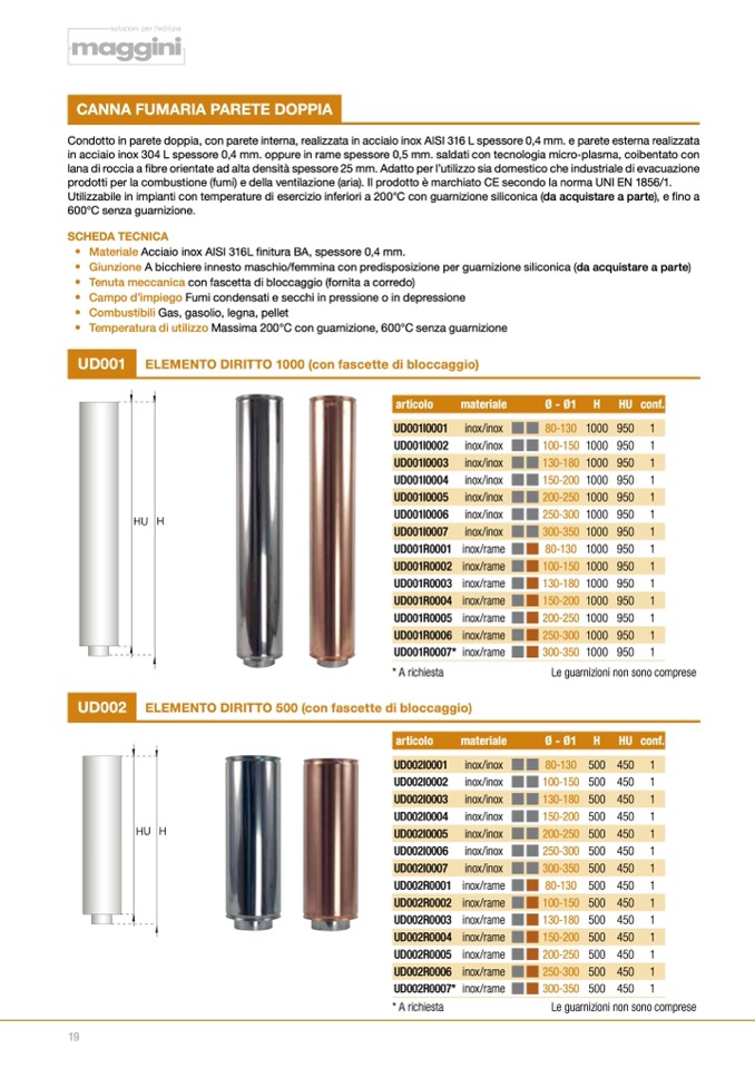 Condotto in parete doppia, con parete interna, realizzata in acciaio inox AISI 316 L spessore 0,4 mm. e parete esterna realizzata