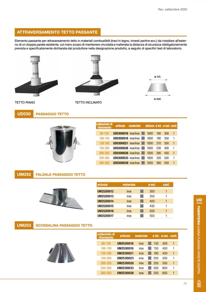 Elemento passante per attraversamento tetto in materiali combustibili (travi in legno, innesti perline ecc.) da installare all’ester-