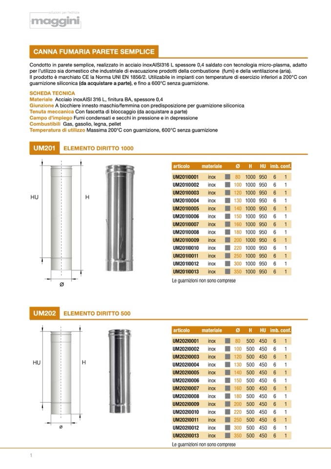 Condotto in parete semplice, realizzato in acciaio inoxAISI316 L spessore 0,4 saldato con tecnologia micro-plasma, adatto