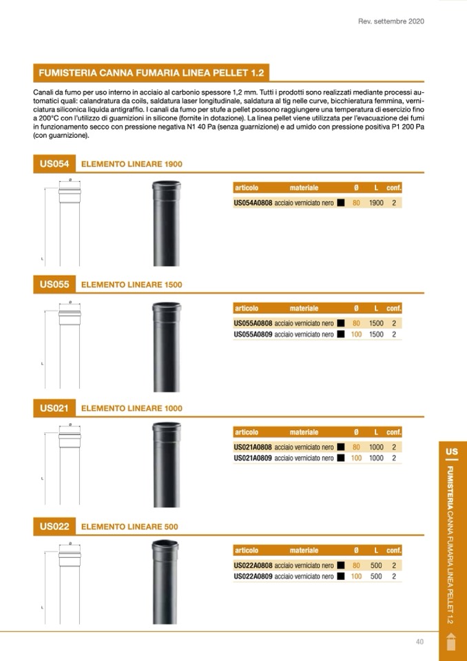 Canali da fumo per uso interno in acciaio al carbonio spessore 1,2 mm. Tutti i prodotti sono realizzati mediante processi au-