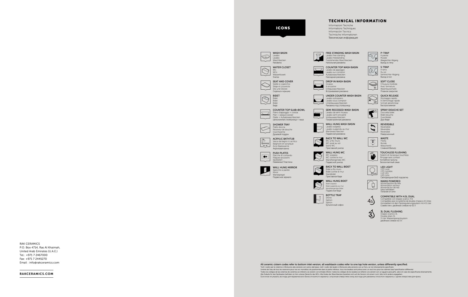 Todos los códigos de las cisternas de cerámica se refieren a la versión con entrada inferior; todos los códigos de los lavabos se refieren a la versión con un agujero para grifo, salvo en caso de especificarse diversamente.