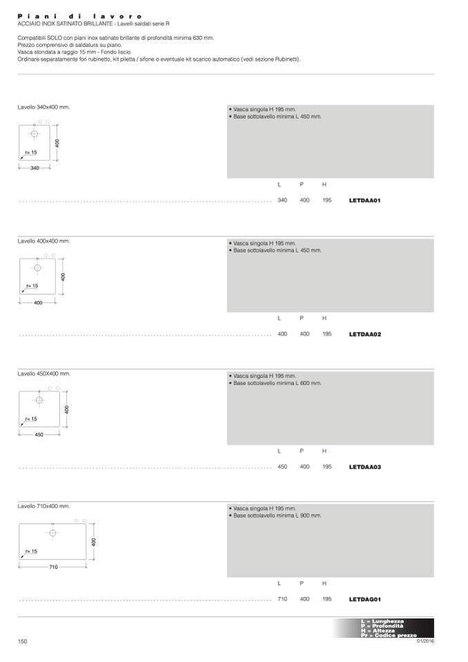 Compatibili SOLO con piani inox satinato brillante di profondità minima 630 mm.