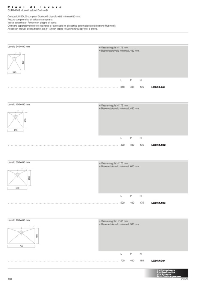 • Vasca singola H 185 mm.