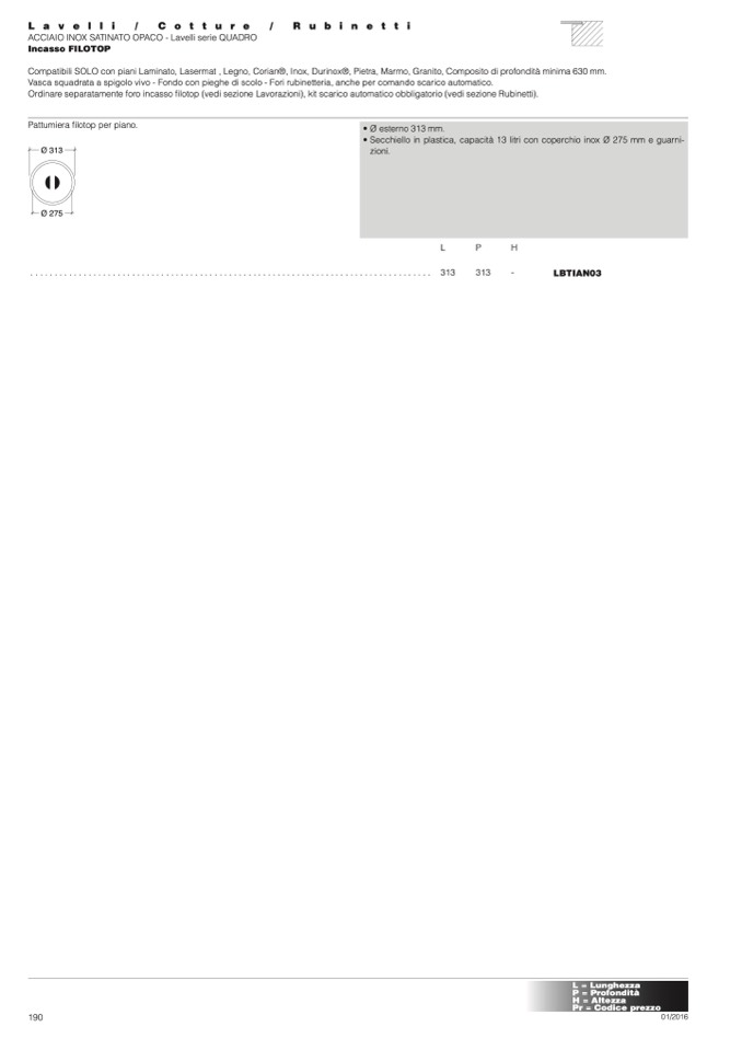 Ordinare separatamente foro incasso filotop (vedi sezione Lavorazioni), kit scarico automatico obbligatorio (vedi sezione Rubinetti).