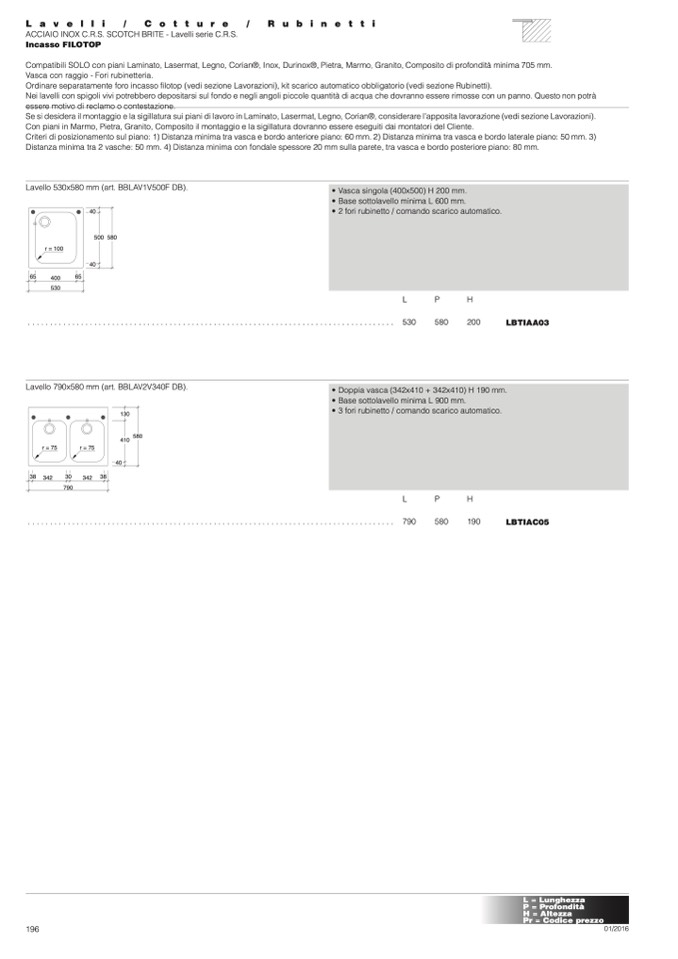 Se si desidera il montaggio e la sigillatura sui piani di lavoro in Laminato, Lasermat, Legno, Corian®, considerare l’apposita lavorazione (vedi sezione Lavorazioni).