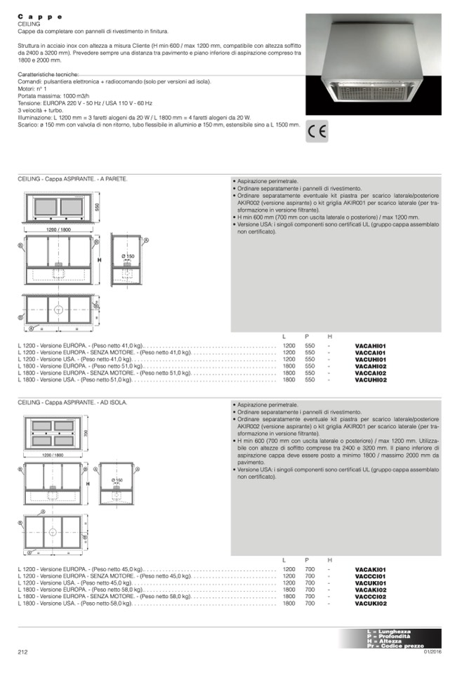 • Versione USA: i singoli componenti sono certificati UL (gruppo cappa assemblato