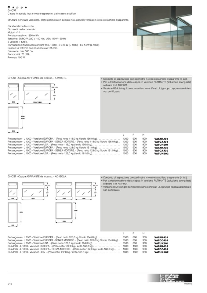 • Versione USA: i singoli componenti sono certificati UL (gruppo cappa assemblato