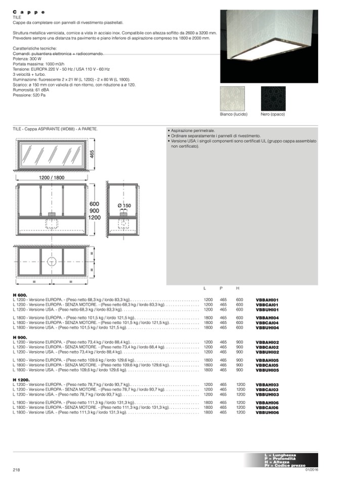 • Versione USA: i singoli componenti sono certificati UL (gruppo cappa assemblato
