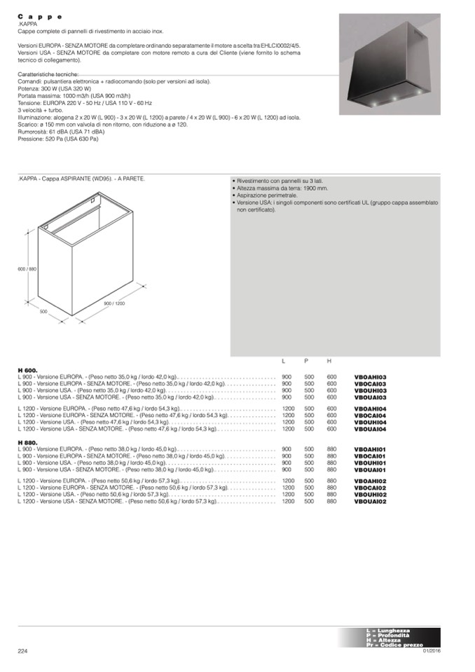 • Versione USA: i singoli componenti sono certificati UL (gruppo cappa assemblato