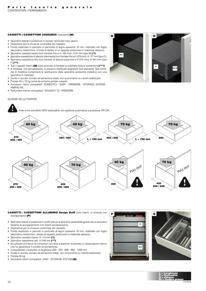 • Portata 40 o 70 kg come da schema portate cassetti.