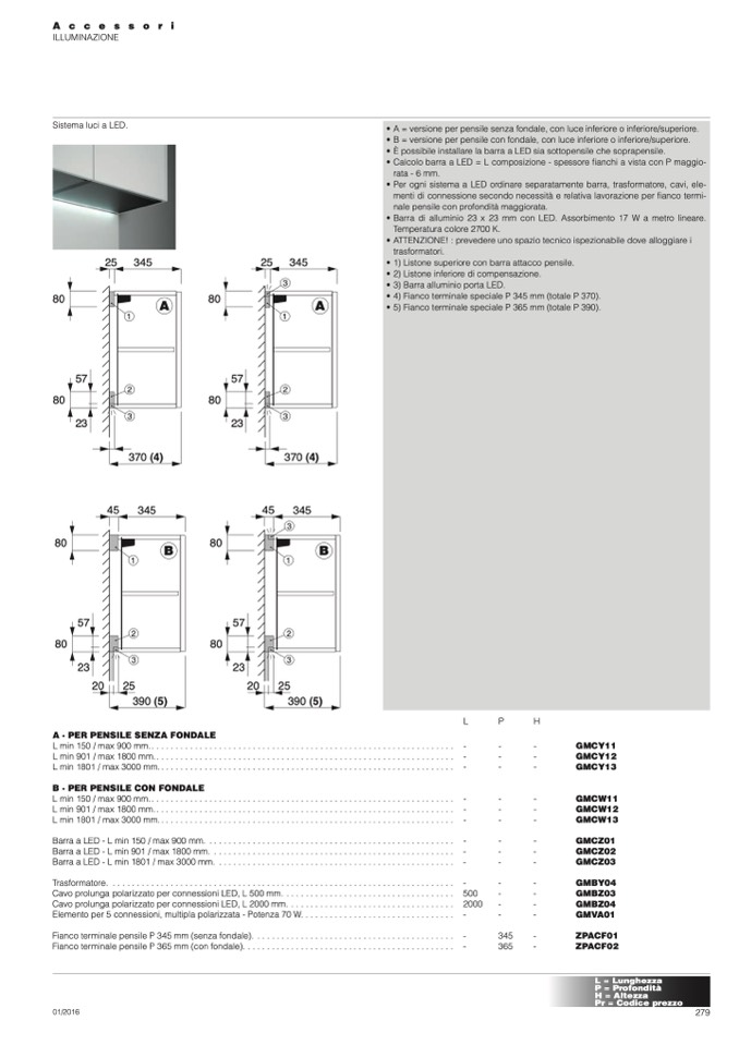 • A = versione per pensile senza fondale, con luce inferiore o inferiore/superiore.