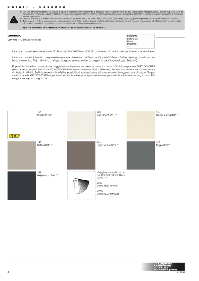 ** Le ante e i pannelli richiesti in una qualsiasi colorazione diversa dal 151 Bianco (410) o dal 003 Bianco Boffi (411) vengono realizzati con