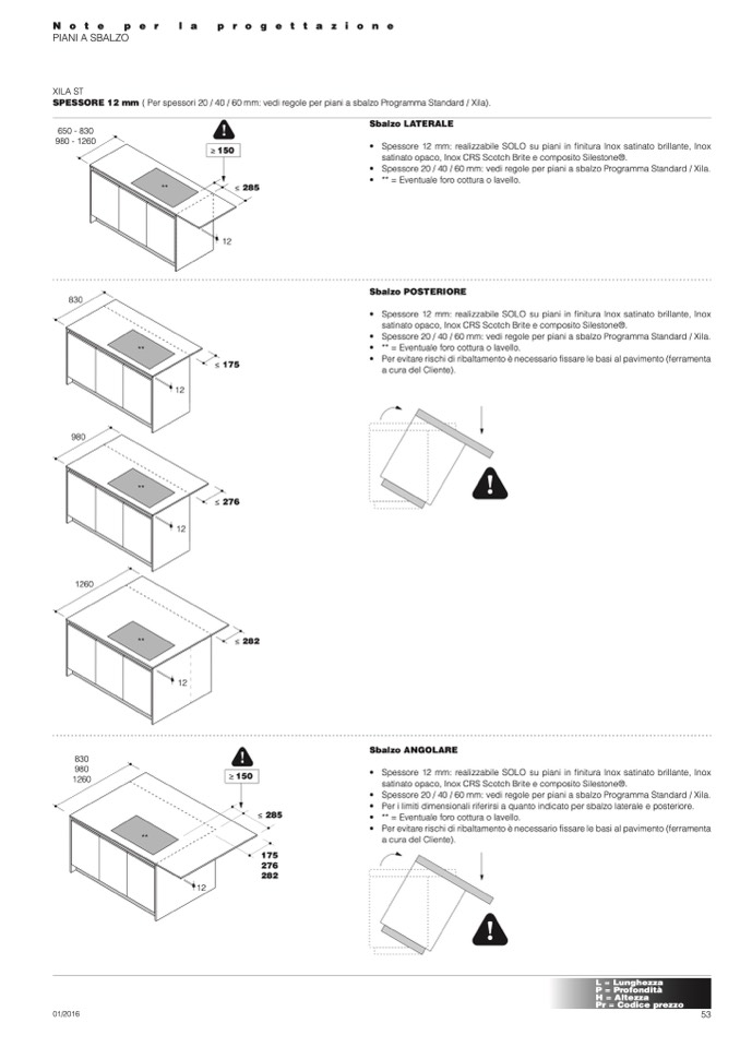 • Spessore 20 / 40 / 60 mm: vedi regole per piani a sbalzo Programma Standard / Xila.