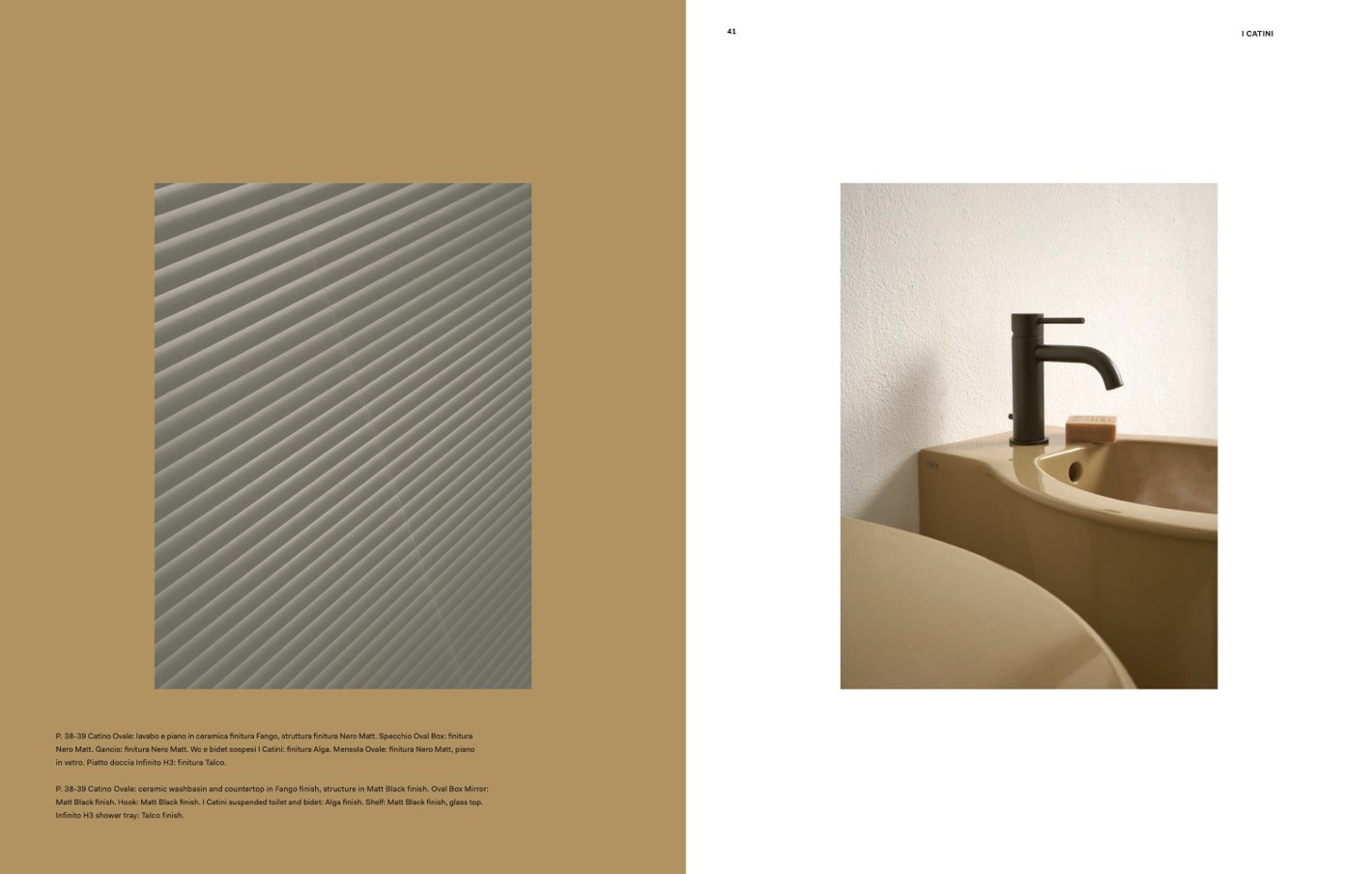 P. 38-39 Catino Ovale: ceramic washbasin and countertop in Fango finish, structure in Matt Black finish. Oval Box Mirror:
