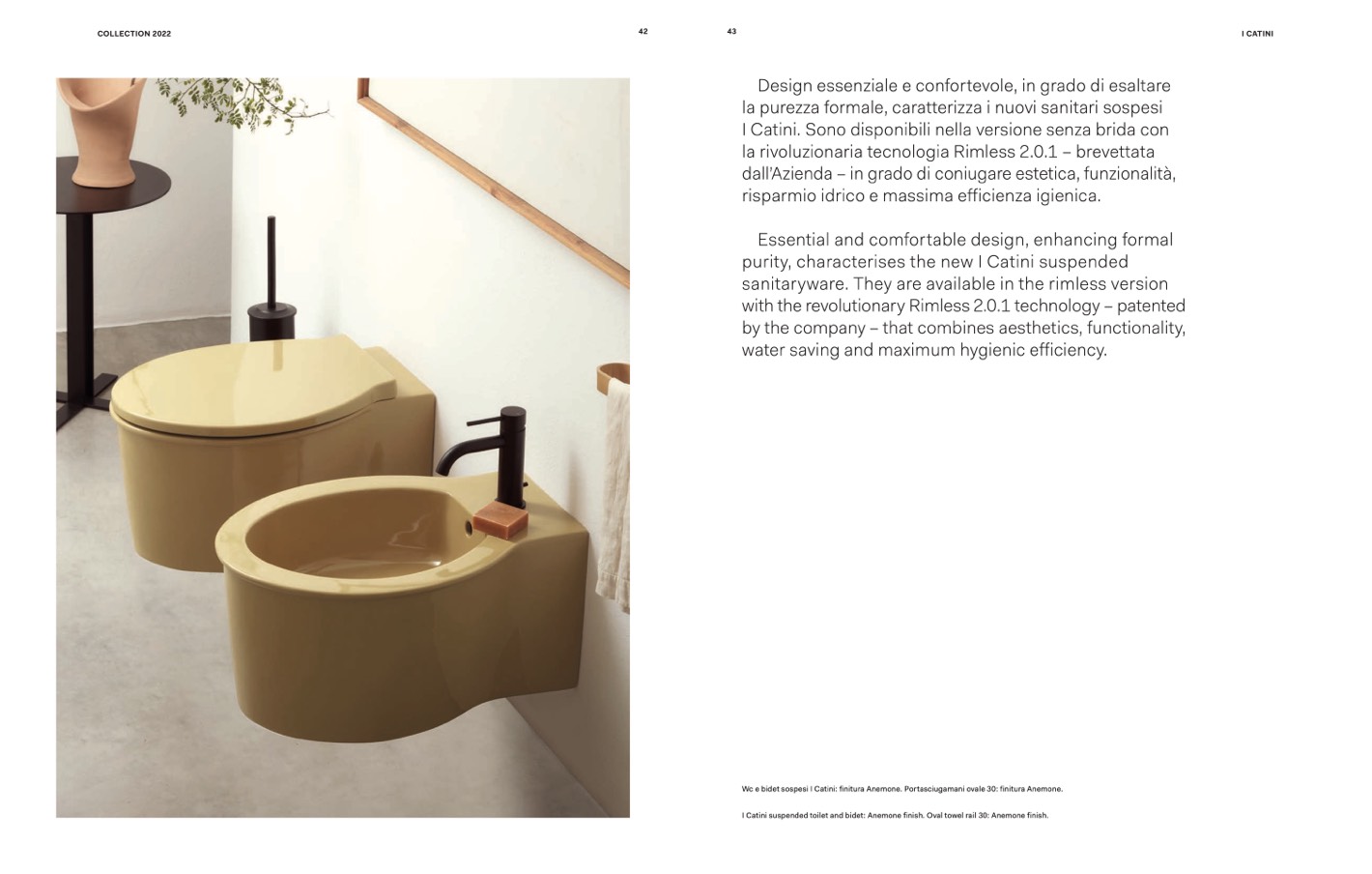 Wc e bidet sospesi I Catini: finitura Anemone. Portasciugamani ovale 30: finitura Anemone.
