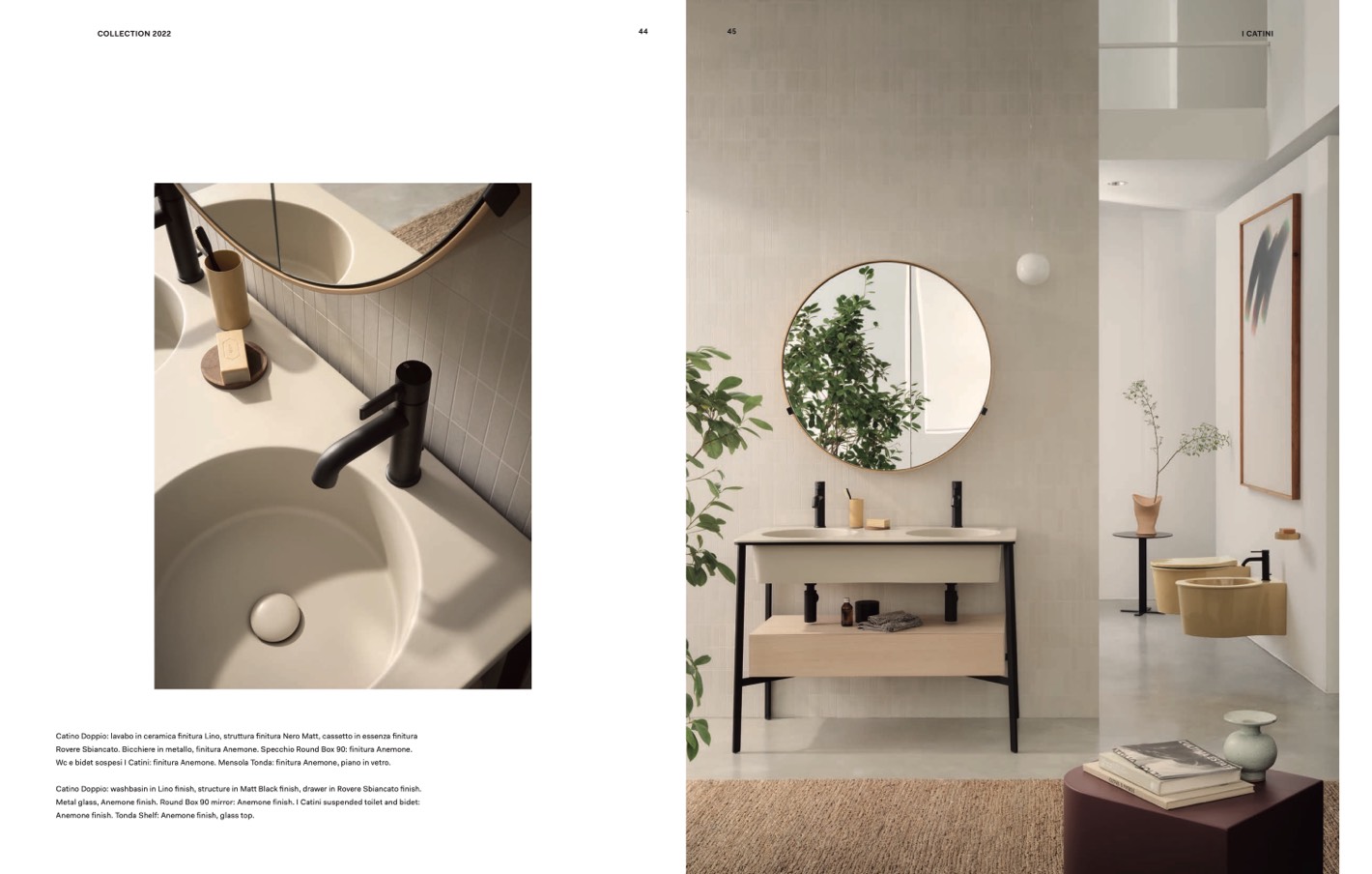 Wc e bidet sospesi I Catini: finitura Anemone. Mensola Tonda: finitura Anemone, piano in vetro.