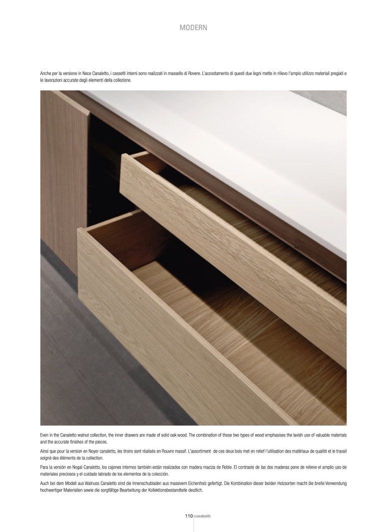 Para la versión en Nogal Canaletto, los cajones internos también están realizados con madera maciza de Roble. El contraste de las dos maderas pone de relieve el amplio uso de