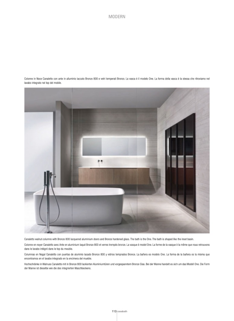 Canaletto walnut columns with Bronze 800 lacquered aluminium doors and Bronze hardened glass. The bath is the One. The bath is shaped like the inset basin.