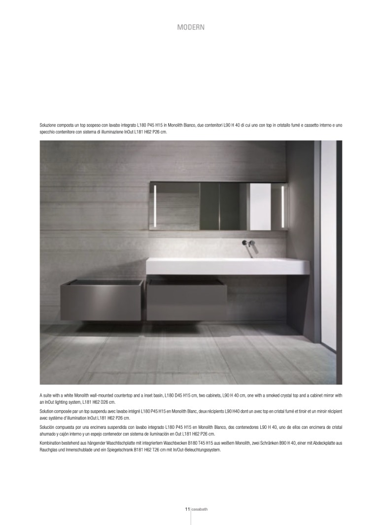 Solution composée par un top suspendu avec lavabo intégré L180 P45 H15 en Monolith Blanc, deux récipients L90 H40 dont un avec top en cristal fumé et tiroir et un miroir récipient