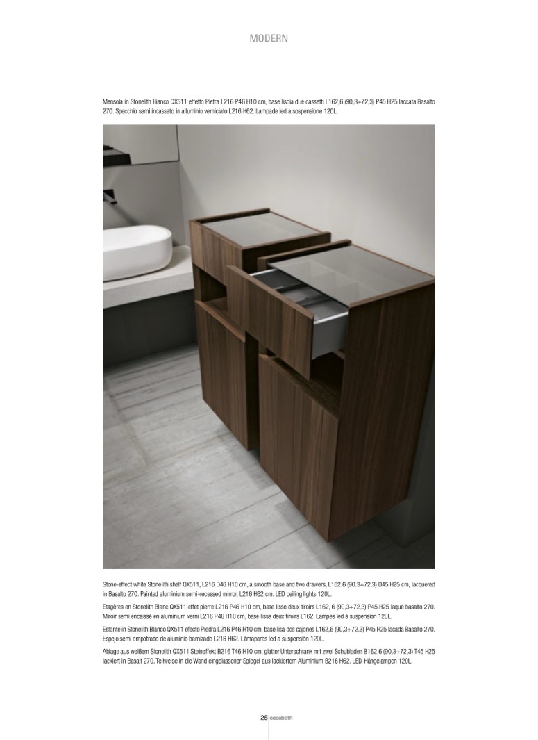lackiert in Basalt 270. Teilweise in die Wand eingelassener Spiegel aus lackiertem Aluminium B216 H62. LED-Hängelampen 120L.