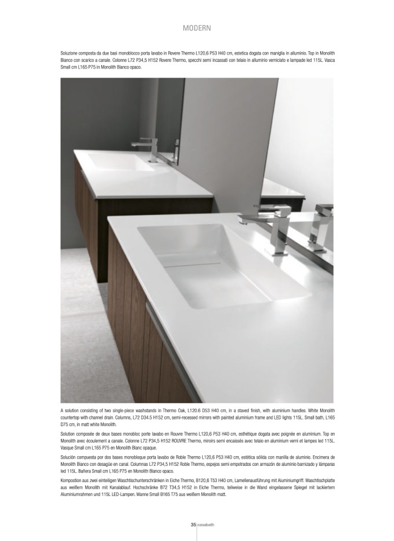Monolith Blanco con desagüe en canal. Columnas L72 P34,5 H152 Roble Thermo, espejos semi empotrados con armazón de aluminio barnizado y lámparas